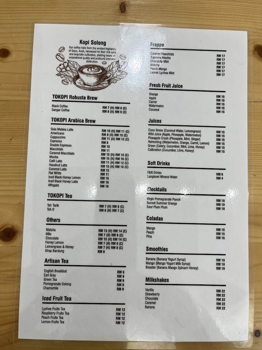 The Warung/Talam menu stands out with its enticing Dim Sum and delightful sandwiches, all served with the signature TOKOPI Coffee. Sides like their Garlic Bread and Steak Fries add the perfect finishing touch at MYR 8.00.